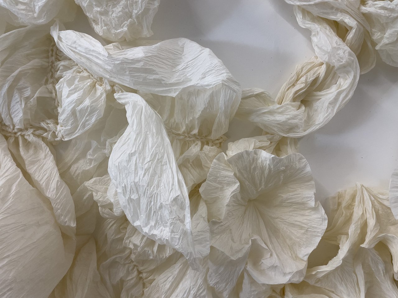 Above is the full installation Impossible Journey. I finished this just before Open Studios and the satisfaction of shaping and affixing the last few meters to the wall was incredible. For scale - the wall is 20’ wide and 10’ tall, and I’ve crumpled, folded, torn, braided, woven, crocheted and otherwise shaped180 m of 1 m wide sekishu paper to make this. You can learn more about this project here.