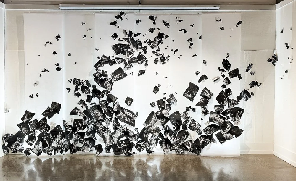 In the main gallery, my installation Close to Home anchors one end of the room. Developed specifically for this site, this installation considers the breadth of man’s relationship to fire - from romance to utility to threat. It incorporates images from family campfires and sketches made with ink ground from burned trees from the CZU complex fire near Big Basin. Together these are built into flames and embers rising high overhead, evocative of wildfire and reminding us of the ever-growing threat of them worldwide. The installation is approximately 25’ x 12’ x 2’, comprising pigment prints and charcoal drawings on paper with protective coatings, Reemay, magnets, and lighting.